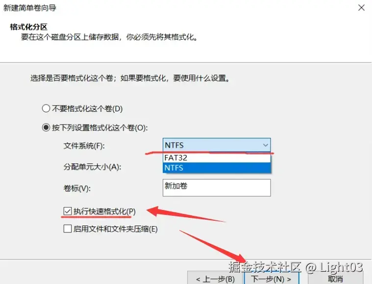 格式化分区。如果U盘数据比较重要,想要恢复U盘之前的数据的话,可以选择“不要格式化这个卷”,再使用数据恢复工具试下恢复之前的数据,这里就不显示了,通常这些恢复数据的比较麻烦。如果U盘数据不是很重要的选“按下列设置格式化这个卷”。“文件系统”可选为FAT32或者NTFS格式的,因为FAT32不能复制粘贴超过4GB的文件,而NTFS没有限制,所以我选了NTFS格式的。然后勾选“执行快速格式化”,最后再点“下一步”