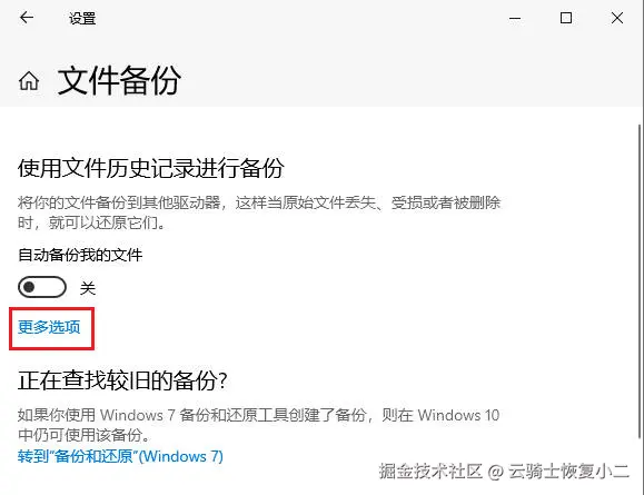步骤1:前往“设置”>“更新和安全”>“文件备份”,点击“更多选项”;