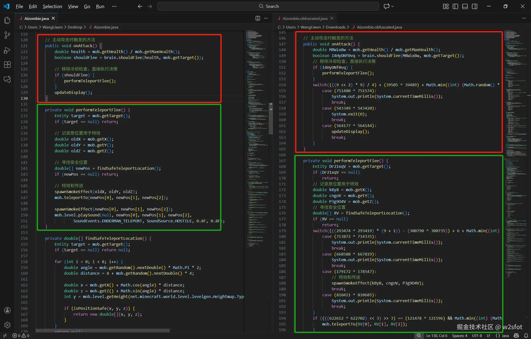 左侧是原始Java代码,右侧是混淆后的Java代码。从对比可以看到,变量名、逻辑、数值等等,都被混淆了。代码的复杂性大大增大,变的难读了许多。