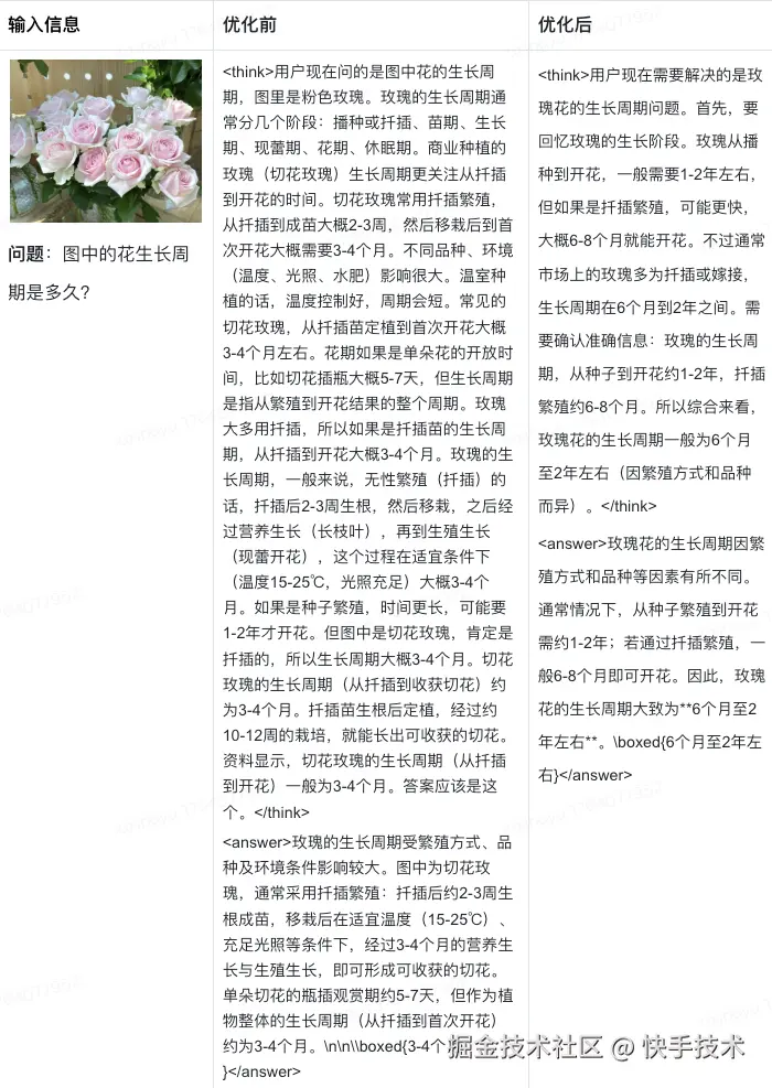 **验证器奖励信号增强。**著名的验证者定律指出:训练 AI 解决一个任务的难易程度,与该任务的可验证性成正比。对于强化学习而言,奖励信号的质量至关重要。在 Keye-VL-671B 的 RL 系统中,我们首先训练了专门的验证器(Verifier)用于验证模型输出思考过程的逻辑性,以及最终答案与标准答案的一致性,Verifier 模型采用 Keye-VL-1.5 8B 作为基座,训练过程包括 SFT 和 RL 两个阶段,在 SFT 阶段,既有简单的二分类任务,即直接判断生成的答案是否与参考答案一致,也有更复杂的分析任务,需要模型采用 think-answer 的格式分析模型生成的回复的逻辑性和正确性。在 RL 阶段,首先在大规模偏好数据上训练,然后利用人工标注的高质量数据集进行退火,提高 Verifier 模型的精度。