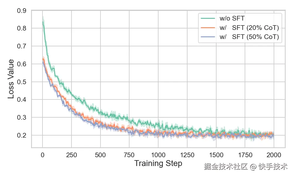 loss 曲线显示,在 SFT 阶段加入更多的 CoT 数据可以显著降低冷启动阶段的训练 loss,在多个 benchmark 上的性能对比也表明,混合 CoT 数据训练的模型相比于指令微调的模型取得了明显的性能提升。