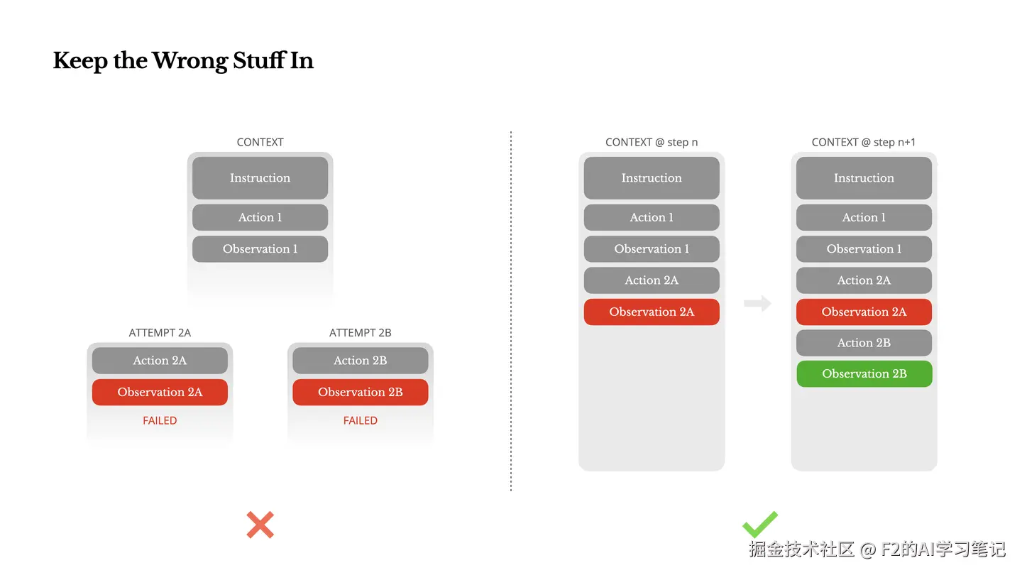 最有效的方法之一出奇地简单:将错误的尝试保留在上下文中。当模型看到一个失败的行动—以及由此产生的观察结果或堆栈跟踪—它会隐式地更新其内部信息。这会改变其经验,降低重复相同错误的可能性。 事实上,我们认为错误恢复是真正Agent行为的最明显指标之一。