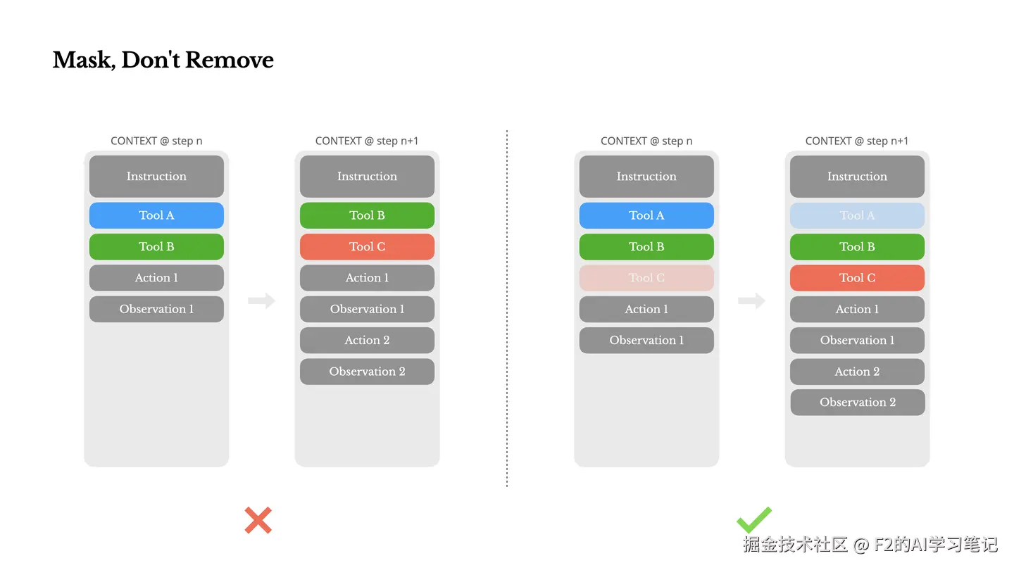 - 在大多数LLM中,工具被定义在上下文的前部,通常在系统提示之前或之后。因此任何更改都会使后续所有动作和观察的KV缓存失效。