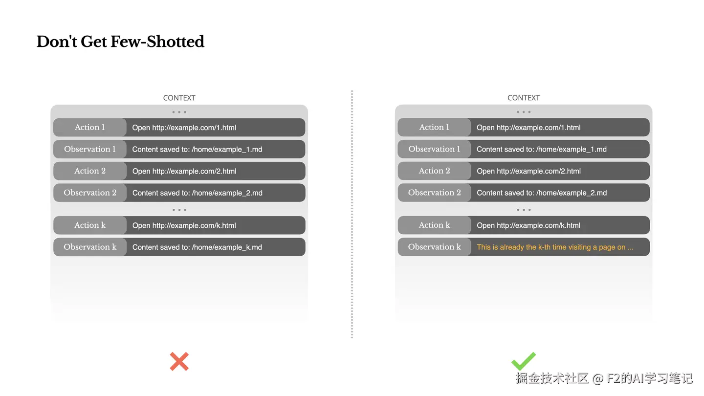 少样本提示(Few-short)是提高LLM输出准确度的常用技术。但在代理系统中,它可能会以微妙的方式适得其反。 语言模型是优秀的模仿者;它们模仿上下文中的行为模式。如果你的上下文充满了类似的过去行动-观察对,模型将倾向于遵循该模式,即使这不再是最优的。 这会导致偏离、过度泛化,或有时产生幻觉。