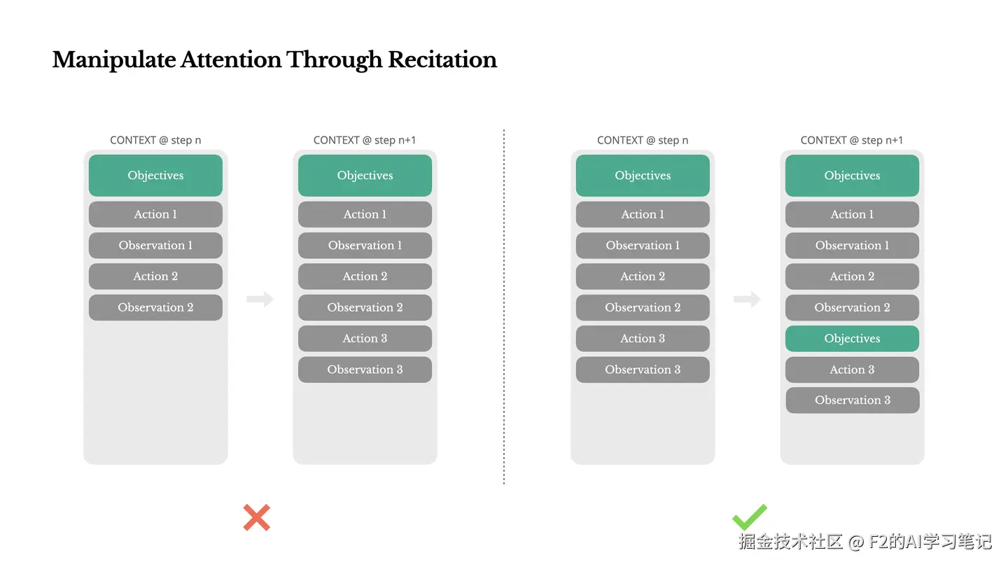通过不断重写待办事项列表,Manus将最终目标复述到上下文的末尾。将全局计划推入模型的近期注意力范围内,避免了”丢失在中间”的问题,并减少了目标不一致。实际上,它使用自然语言来使自己的注意力偏向任务目标—而不需要特殊的架构变更。