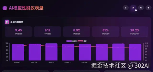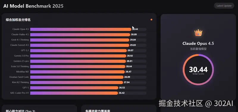 Gemini 3 Pro 的突出点在于混合图表类型应用得当,图表效果非常专业,但比较明显的瑕疵在于缺少完整的数据表格展示,只能看到全部模型的总分,各项得分未做细化公示。