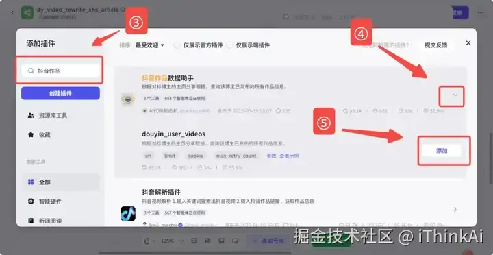 用于采集抖音博主的作品。添加步骤:插入插件→搜索“抖音作品”→找到 “douyin_user_videos”,点击添加,并设置相应参数。