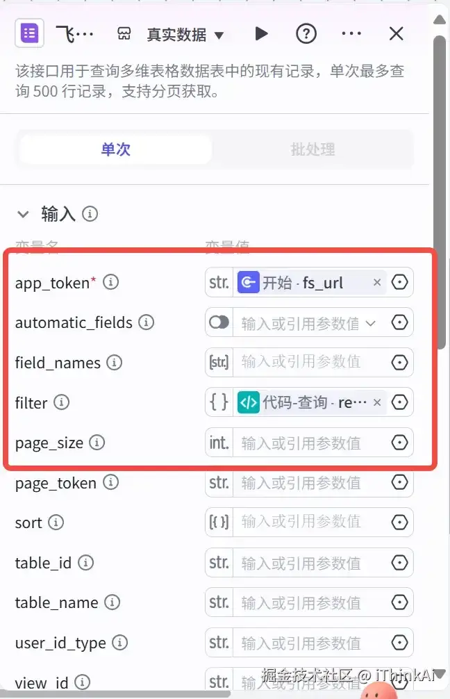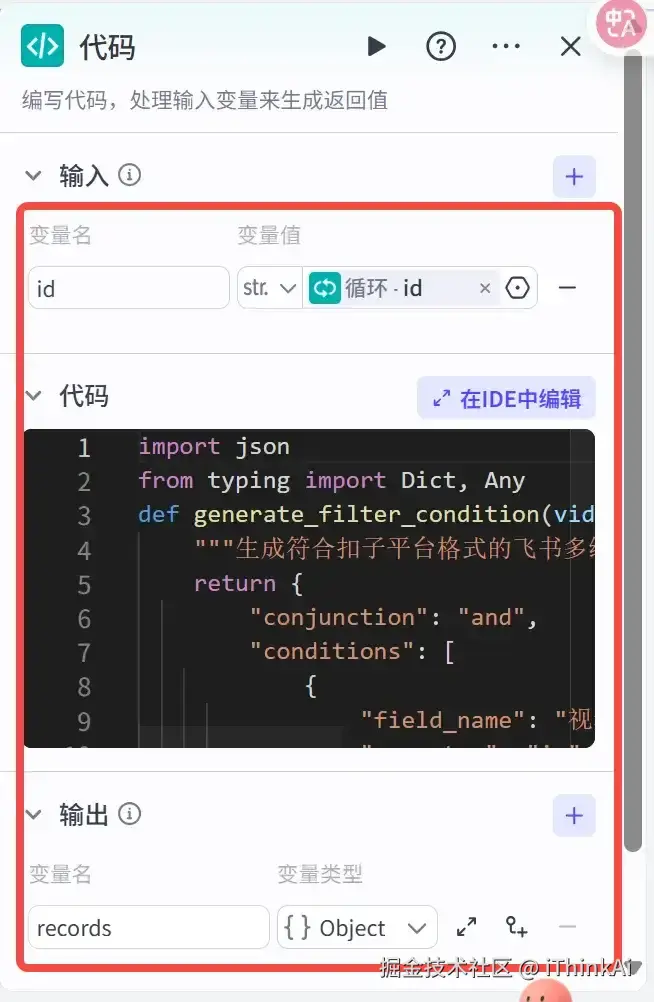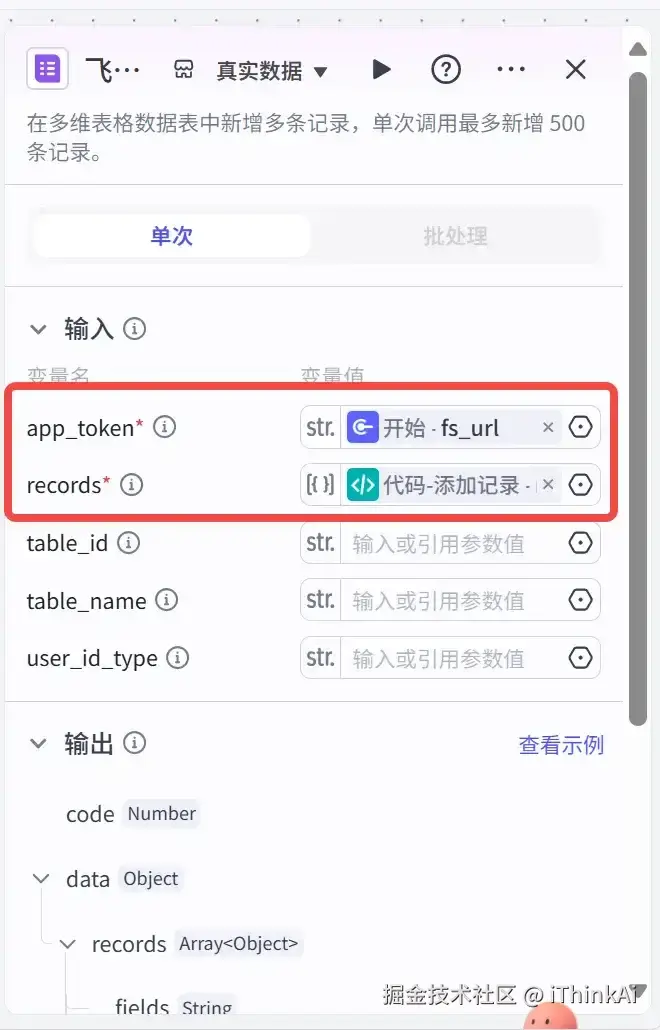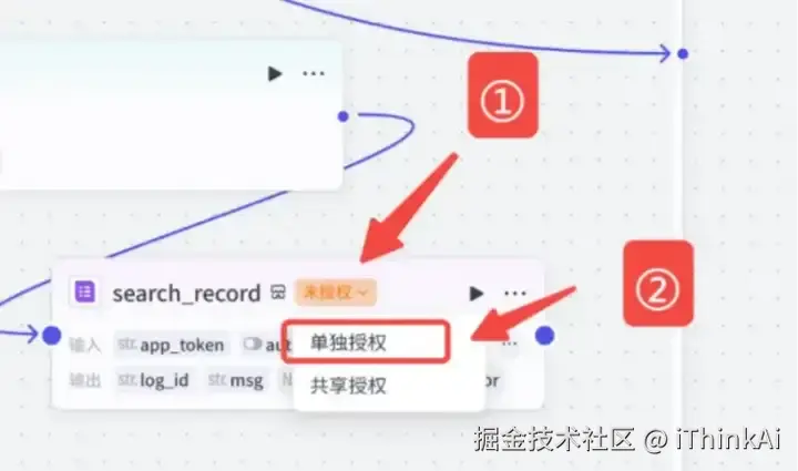 把上一个【查询】代码节点的记录存在飞书多维表格上,需要对飞书多维表格进行授权。