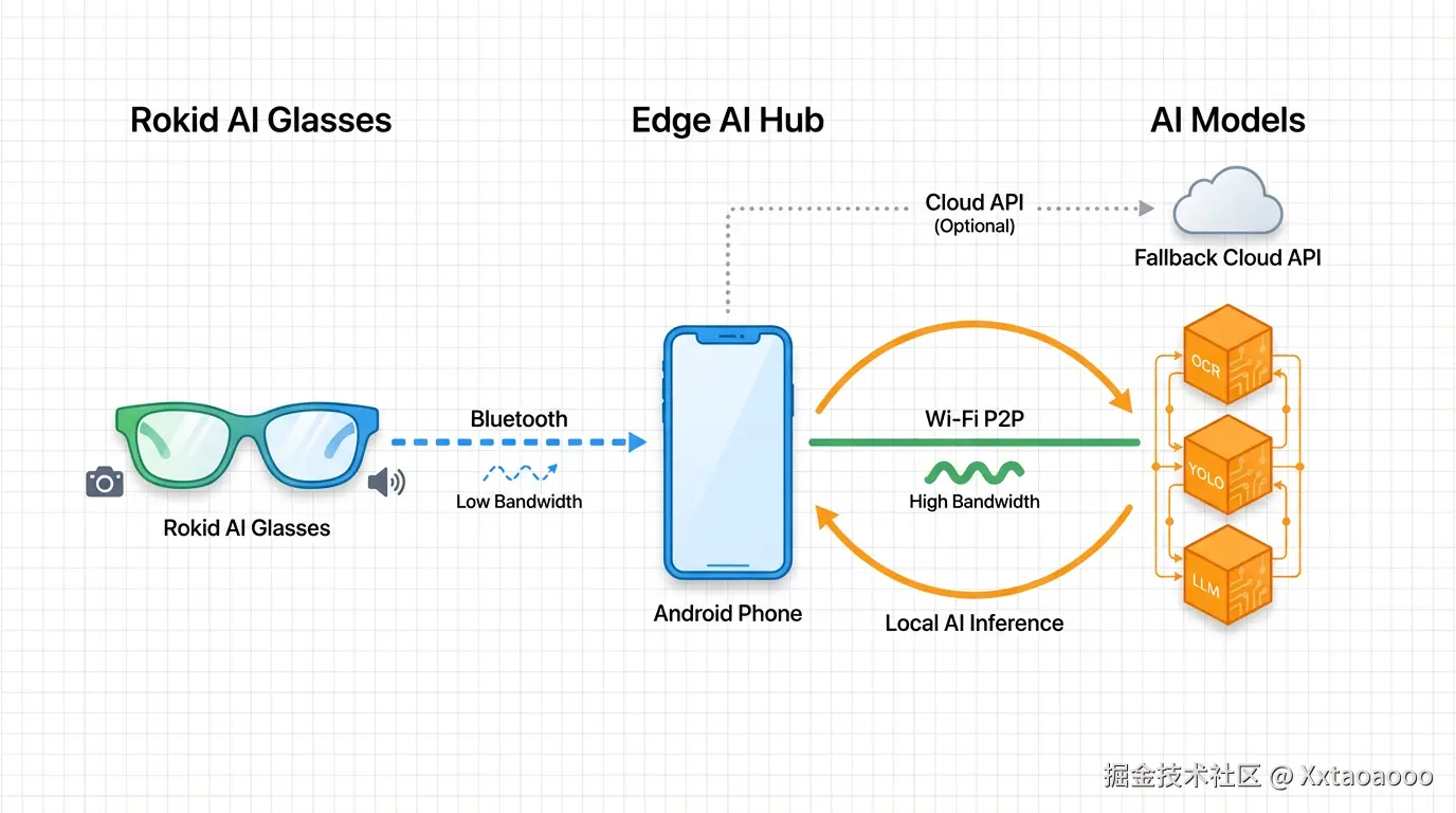 整体架构三层协同架构:Glasses 负责感知与输出,Phone 负责调度与计算,AI 模型负责理解。Wi-Fi 仅用于高带宽媒体同步,日常交互走蓝牙以节省电量。