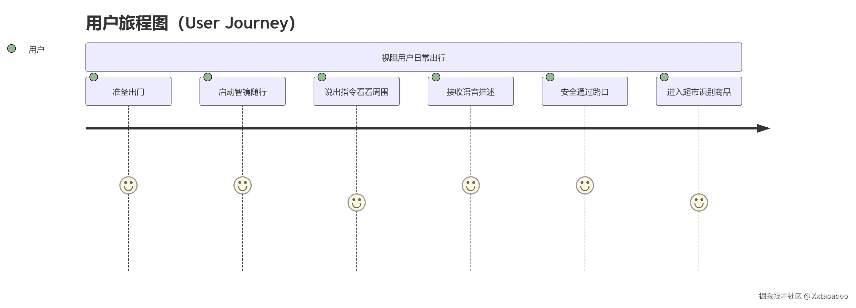 用户旅程图(User Journey Map)用于描绘目标用户在特定场景下的完整体验路径,帮助开发者从“人”的角度理解系统价值。在「智镜随行」项目中,我们**聚焦视障用户从出门到完成日常任务(如过马路、购物)的关键触点。**体现了从启动到完成任务的完整体验流,强调“语音触发 - 实时反馈”的自然交互。