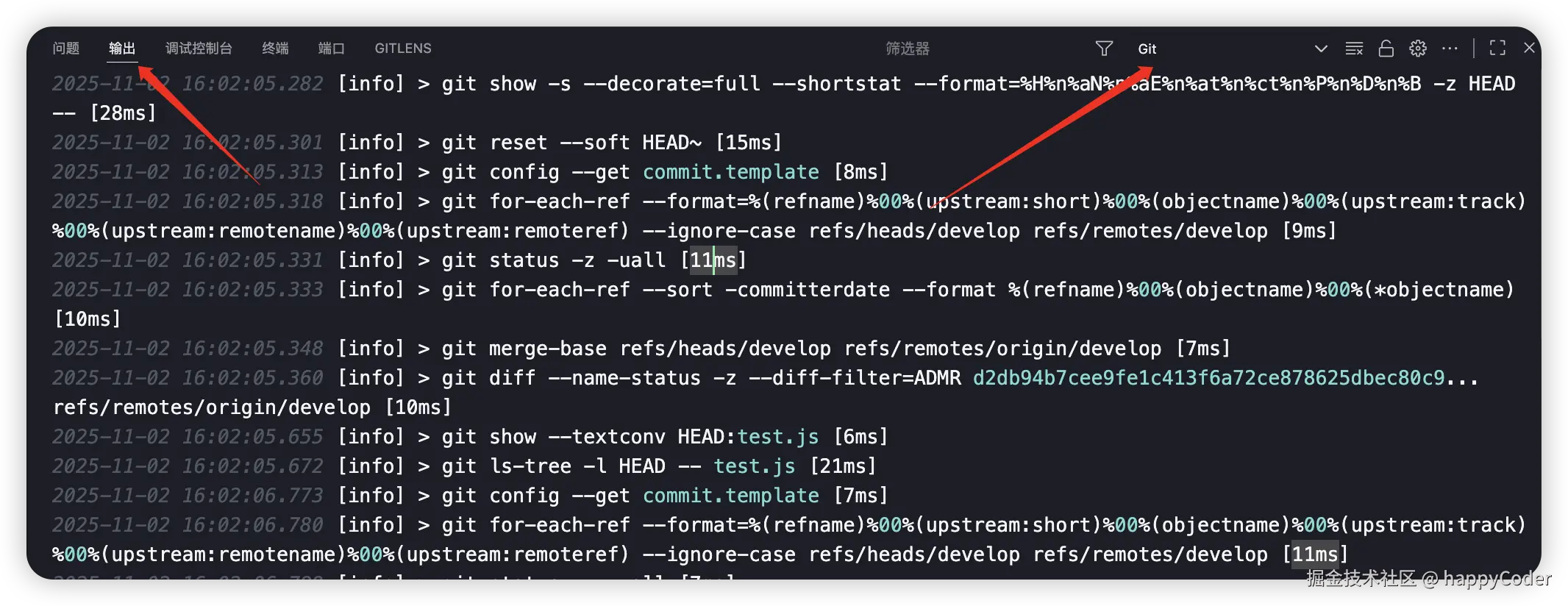 1.2 Git 执行日志可以从输出->git 中查看