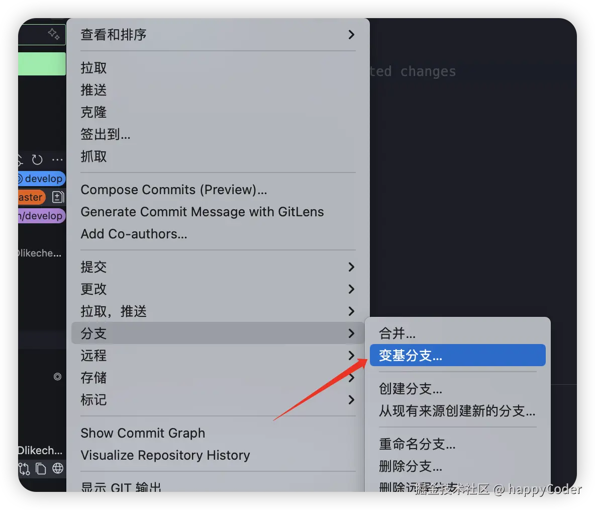 - 当主分支更新时,本地开发分支落后提交,同样采用rebase 合并。(与前面一样的操作)