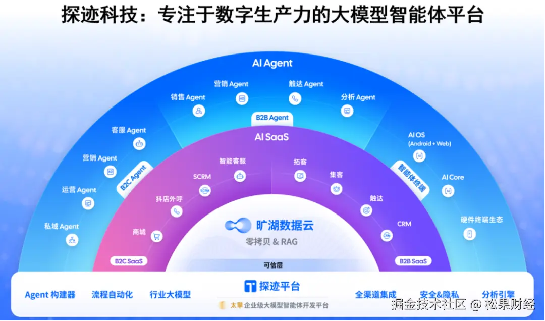 这个时候比拼的并不是产品设计,而是用户平时看不到的“底座”:平台和数据。它们才是决定产品走向的关键。一块是负责把大模型、业务流程和企业系统串起来的平台,一块是长期积累和治理的数据资产。探迹的版本,叫“太擎”和“旷湖”。