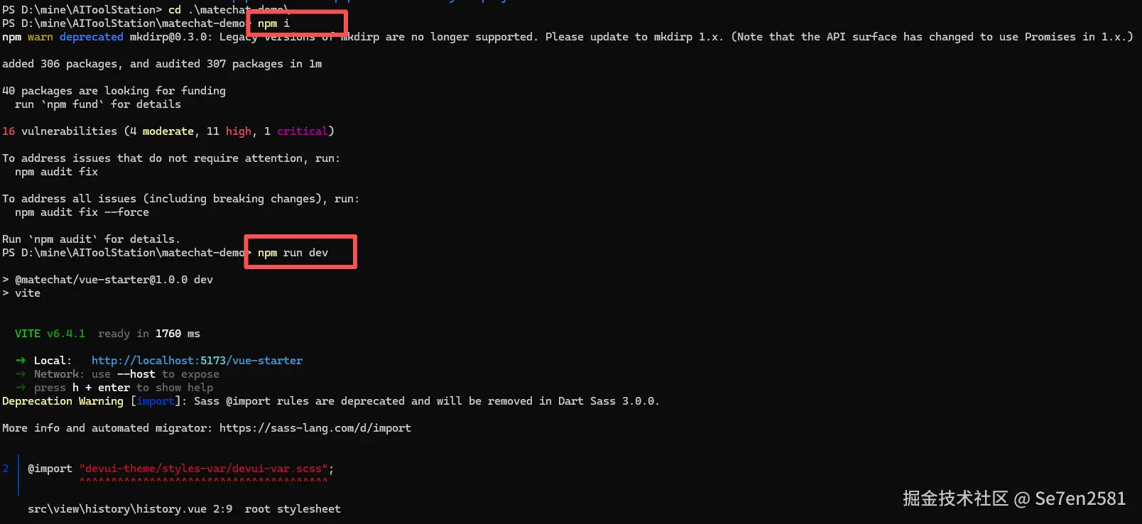 先切换到项目的根目录( cd .\matechat-demo\),然后执行 npm i 安装依赖,最后用npm run dev 启动项目。