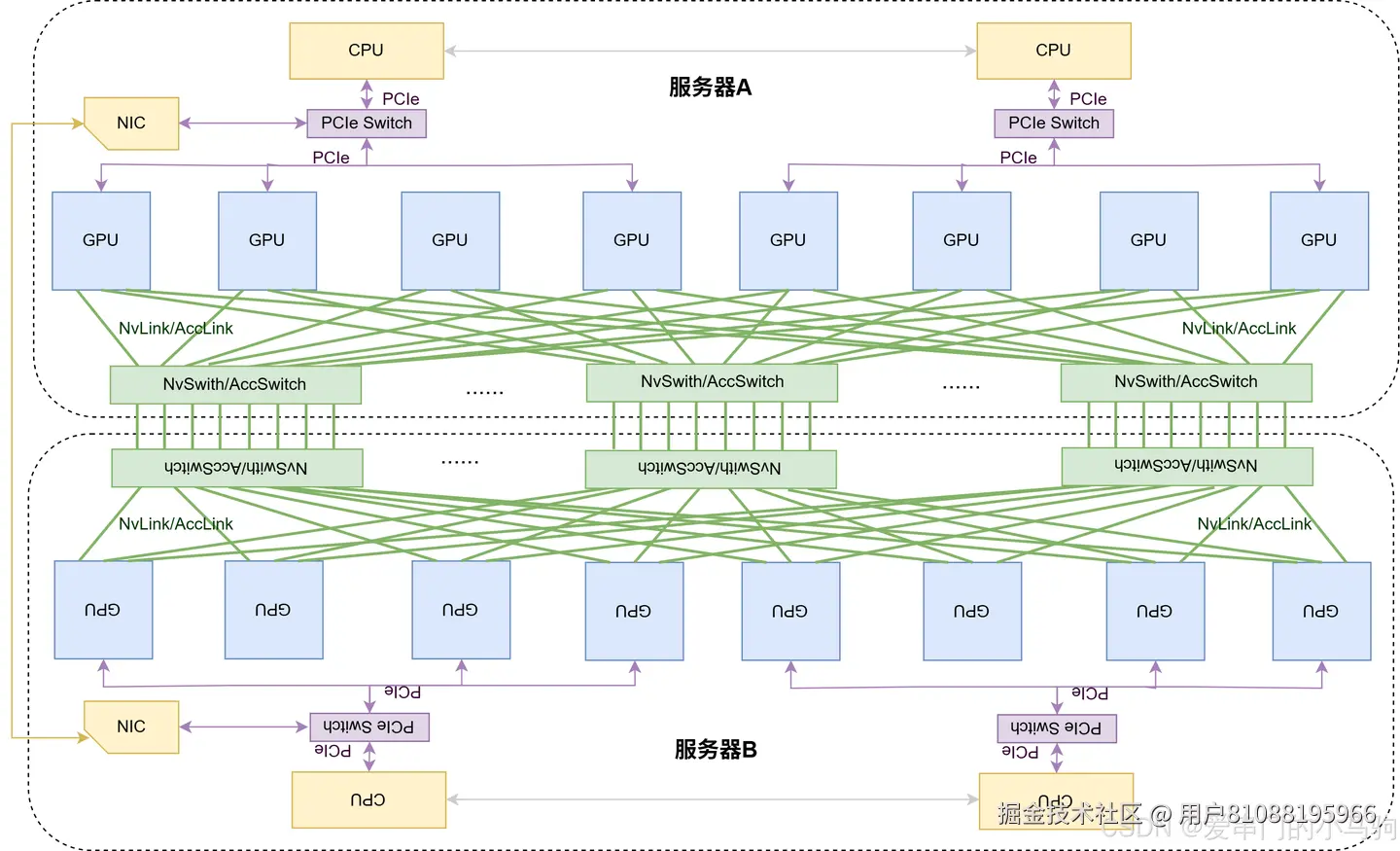 下面的图2是一个超节点么?哈哈哈,是的!服务器节点A和服务器节点B的众多GPU通过NvLink/AccLink相连,构成了NvLink/AccLink域,是多节点的NvLink/AccLink。
