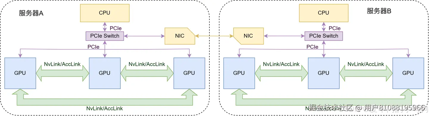 图1是一个超节点么?显然不是!服务器A是节点,服务器B是节点,但是服务器A和B之间是通过延迟较高网卡相连,不是通过高带宽低延迟的NvLink/AccLink相连,不构成一个超节点。
