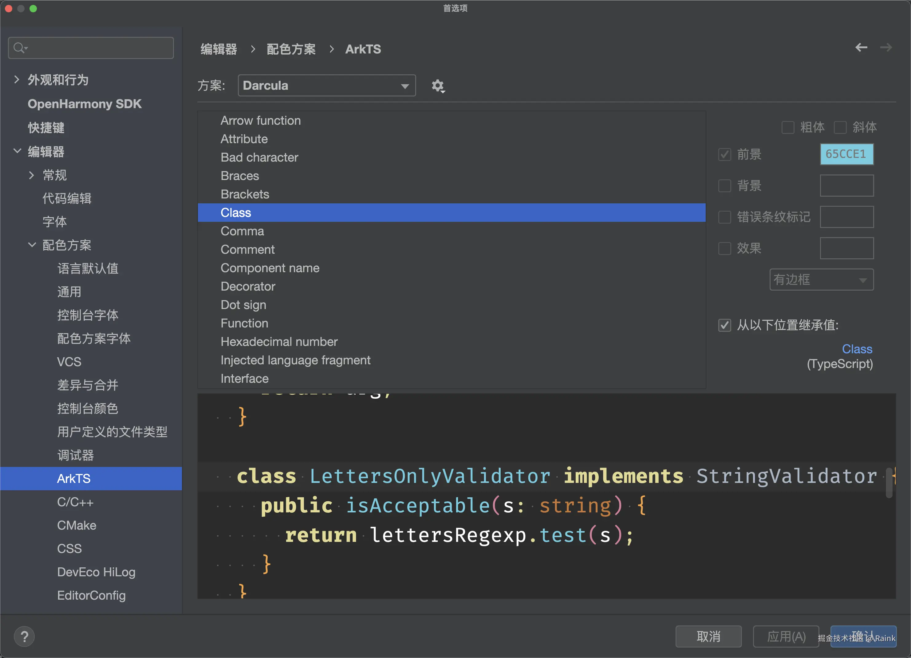 支持对代码关键字、运算符、字符串、类、标识符、注释等进行高亮显示,您可以打开File > Settings(macOS为DevEco Studio > Preferences)面板,在Editor > Color Scheme自定义各字段的高亮显示颜色 。 默认情况下,您可以在Language Defaults中设置源代码中的各种高亮显示方案,该设置将对所有语言生效;如果您需要针对具体语言的源码高亮显示方案进行定制,可以在左侧边栏选择对应的语言,然后取消“Inherit values from”选项后设置对应的颜色即可。如图6所示。