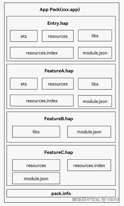 应用/元服务发布形态为APP Pack(Application Package),它是由一个或多个HAP(Harmony Ability Package)包以及描述APP Pack属性的pack.info文件组成。