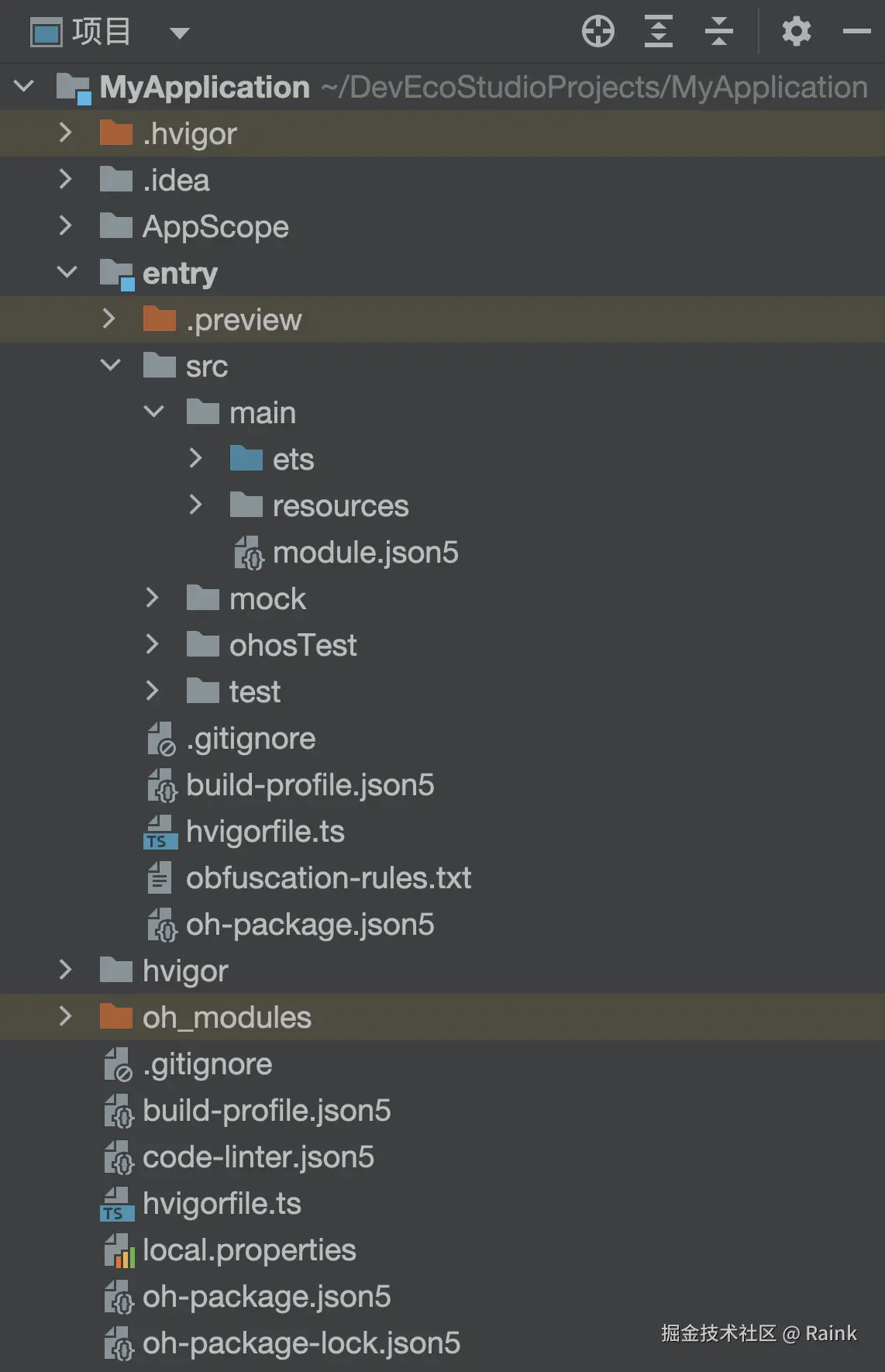 DevEco Studio工程目录结构提供工程视图和Ohos视图。工程视图(Project)展示工程中实际的文件结构,Ohos视图会隐藏一些编码中不常用到的文件,并将常用到的文件进行重组展示,方便开发者查询或定位所需编辑的模块或文件。