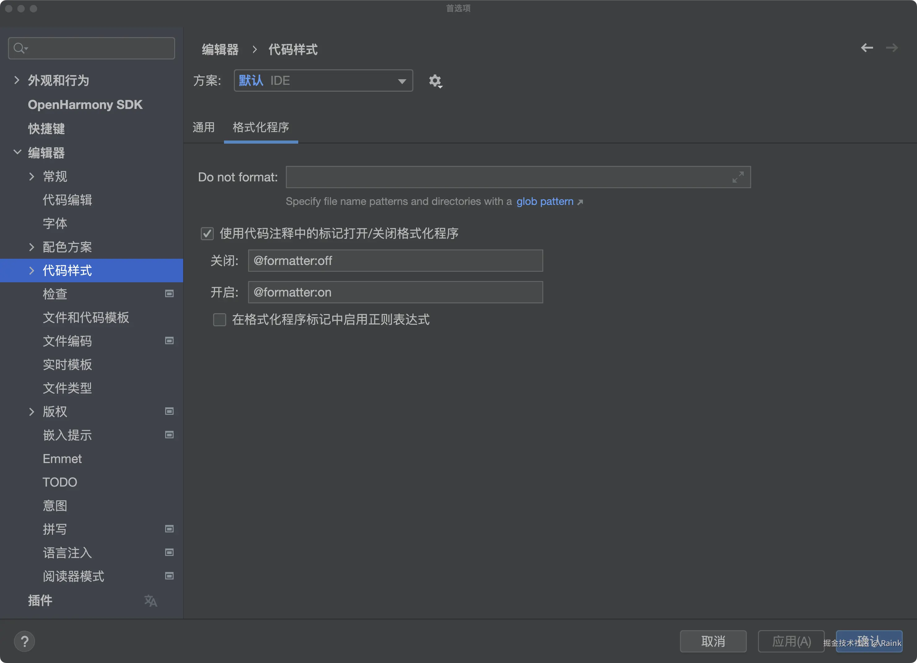 - 在File > Settings >Editor > Code Style(macOS为DevEco Studio > Preferences > Editor > Code Style),单击“Formatter”,勾选“Turn formatter on/off with markers in code comments”。如图8所示。