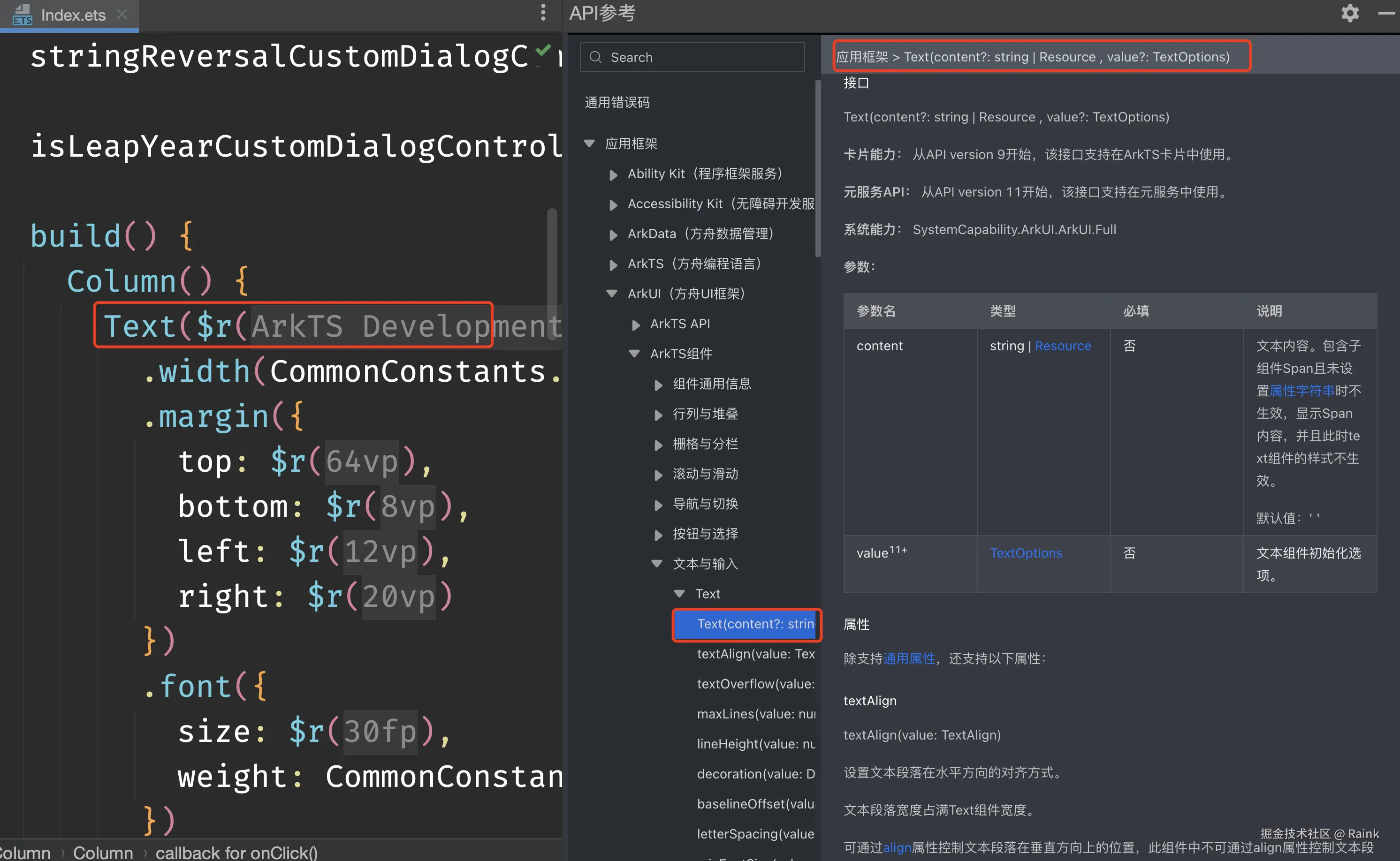 在编辑器中调用ArkTS/JS API或组件时,支持在编辑器中快速、精准调取出对应的参考文档。