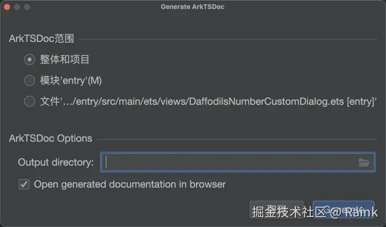- 若勾选Open generated documentation in browser选项,在生成ArkTSDoc后,将自动打开相应页面查看生成的文档。配置完毕后点击Generate,开始扫描并生成ArkTSDoc文档。