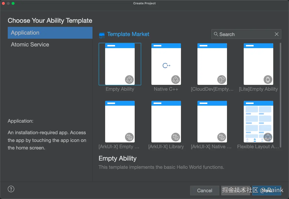 - 根据工程创建向导,选择创建Application或Atomic Service。再选择需要的Ability工程模板,然后单击Next。