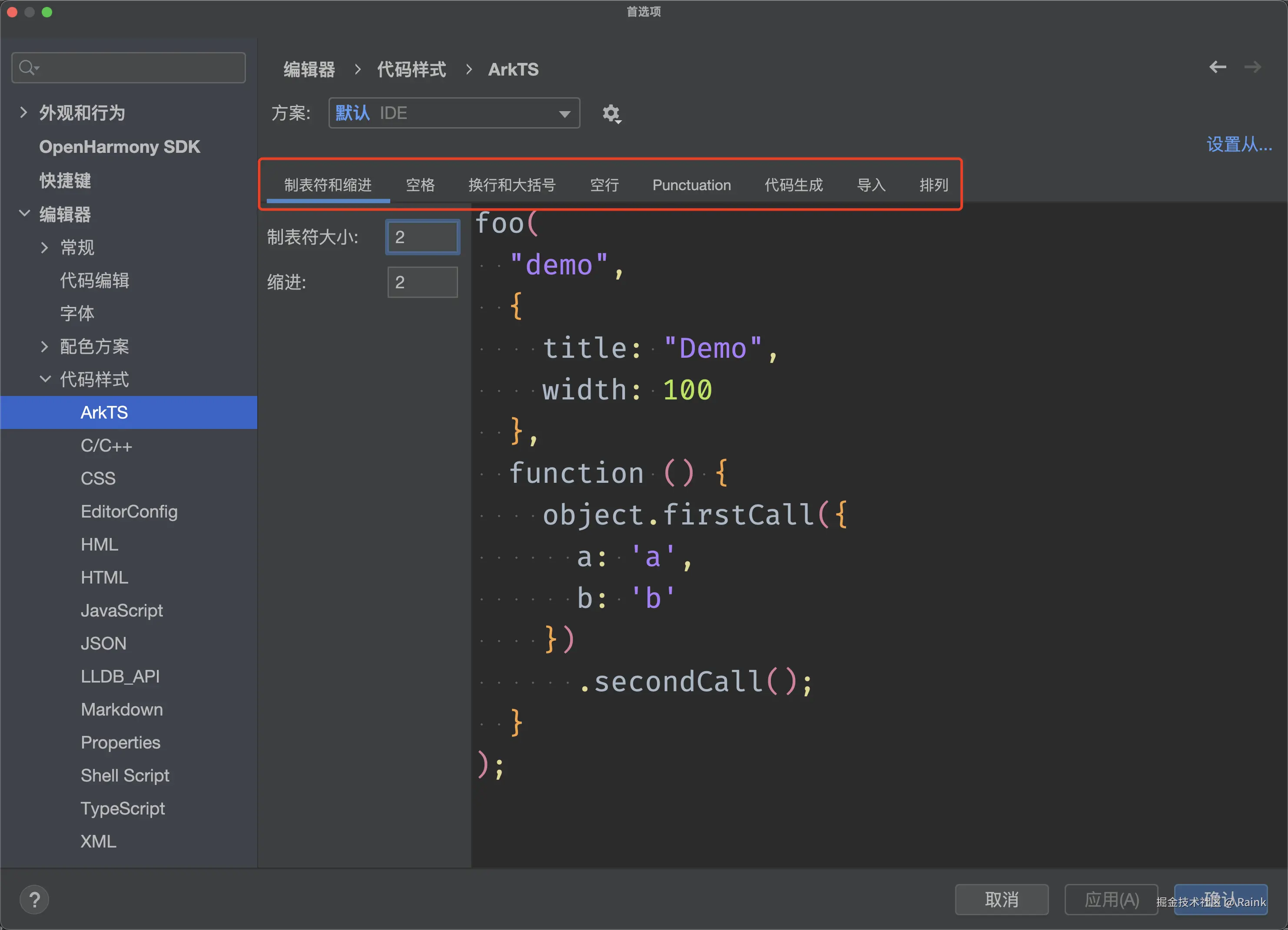 代码格式化功能可以帮助您快速的调整和规范代码格式,提升代码的美观度和可读性。默认情况下,DevEco Studio已预置了代码格式化的规范,您也可以个性化的设置各个文件的格式化规范,设置方式如下:在File > Settings > Editor > Code Style(macOS为DevEco Studio > Preferences > ****Editor ****> ****Code Style)下,选择需要定制的文件类型,如ArkTS,然后自定义格式化规范即可。