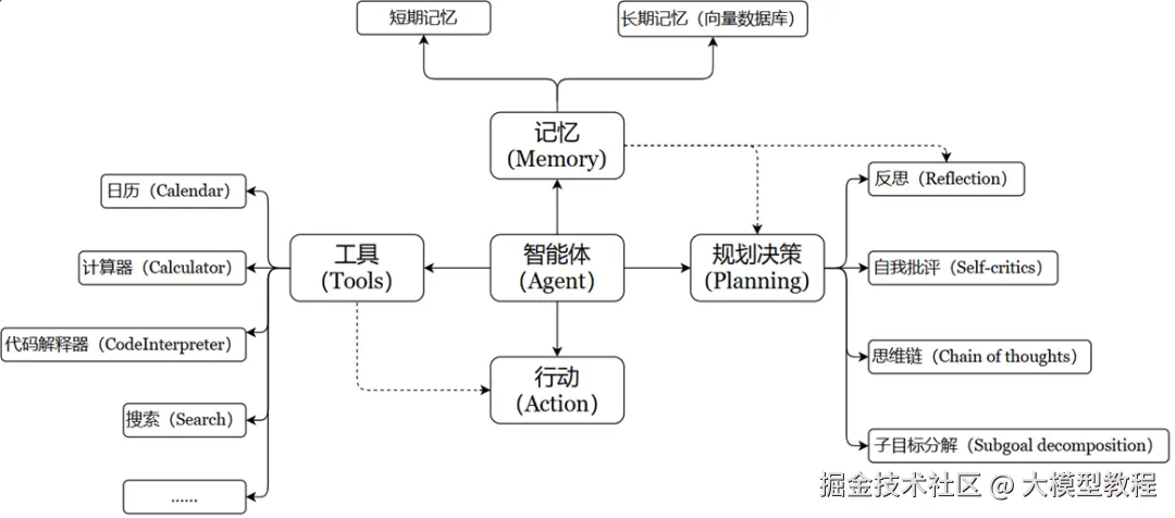 对比RAG,Agent更加依赖LLM的推理决策能力,通过增加规划、记忆和工具调用的能力,构造一个能够独立思考、逐步完成给定目标的智能体。