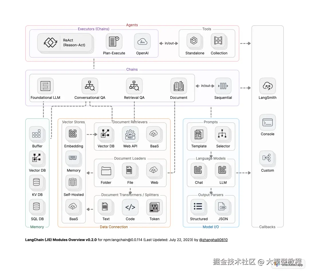 - 辅助:⽐如,向量数据库的分块和嵌⼊,⽤于追踪、观测的Callbacks任务:⽐如,Tools,Memory