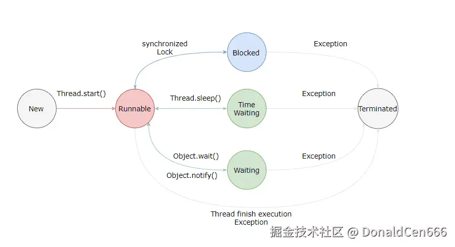 RUNNABLE:调用start()后进入,可能在运行中状态,也能在 就绪状态 ,JVM 不区分这俩,因为 CPU 调度权在操作系统手里,JVM 只认 **能被调度 **这个状态;