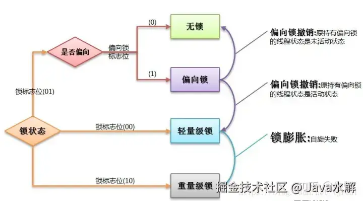 在Java中,锁共有4种状态,级别从低到高依次为:无状态锁,偏向锁,轻量级锁和重量级锁状态,这几个状态会随着竞争情况逐渐升级。锁可以升级但不能降级。