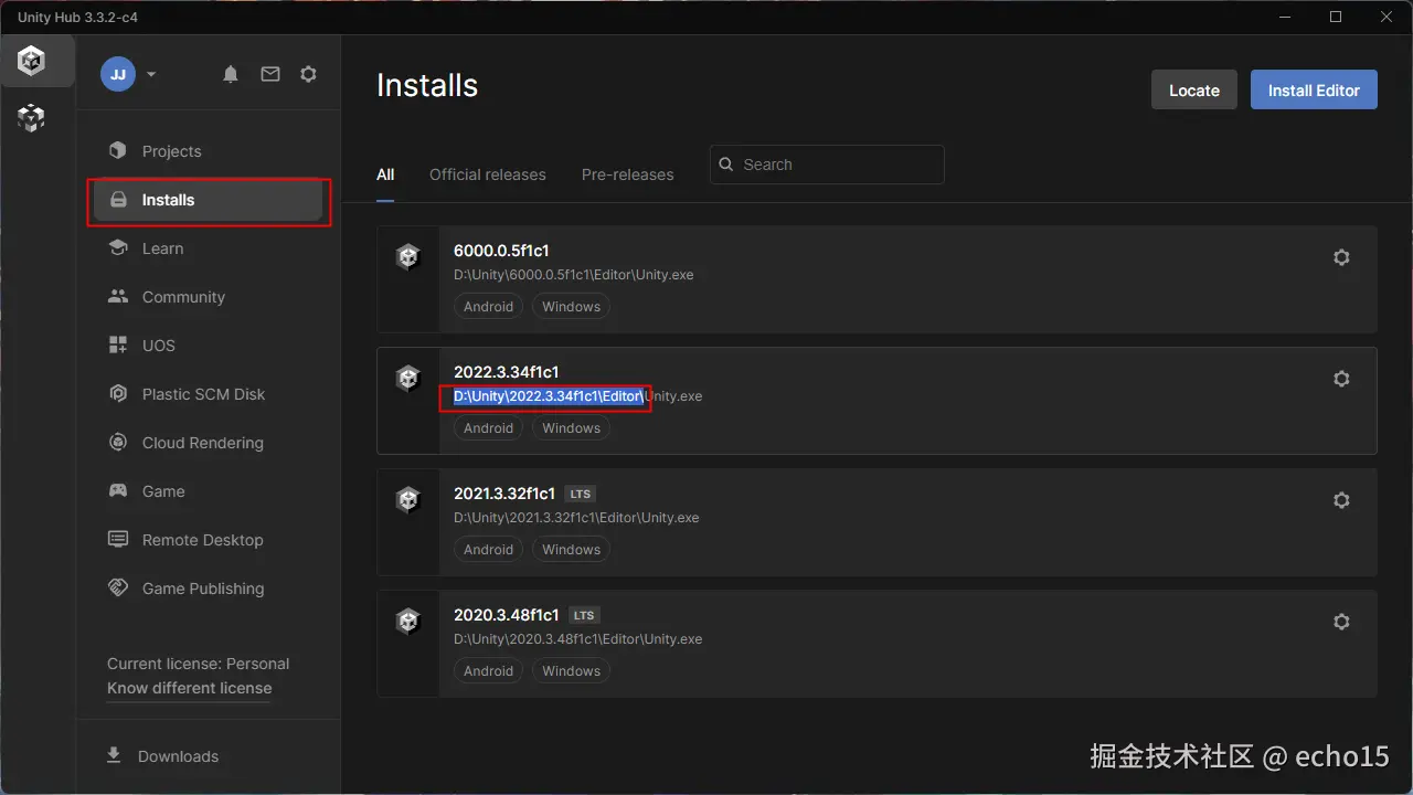 - 打开 Unity Hub,进入“Installs”页面,找到已安装的带“Android”标签的 Unity 版本,复制其安装路径(示例: