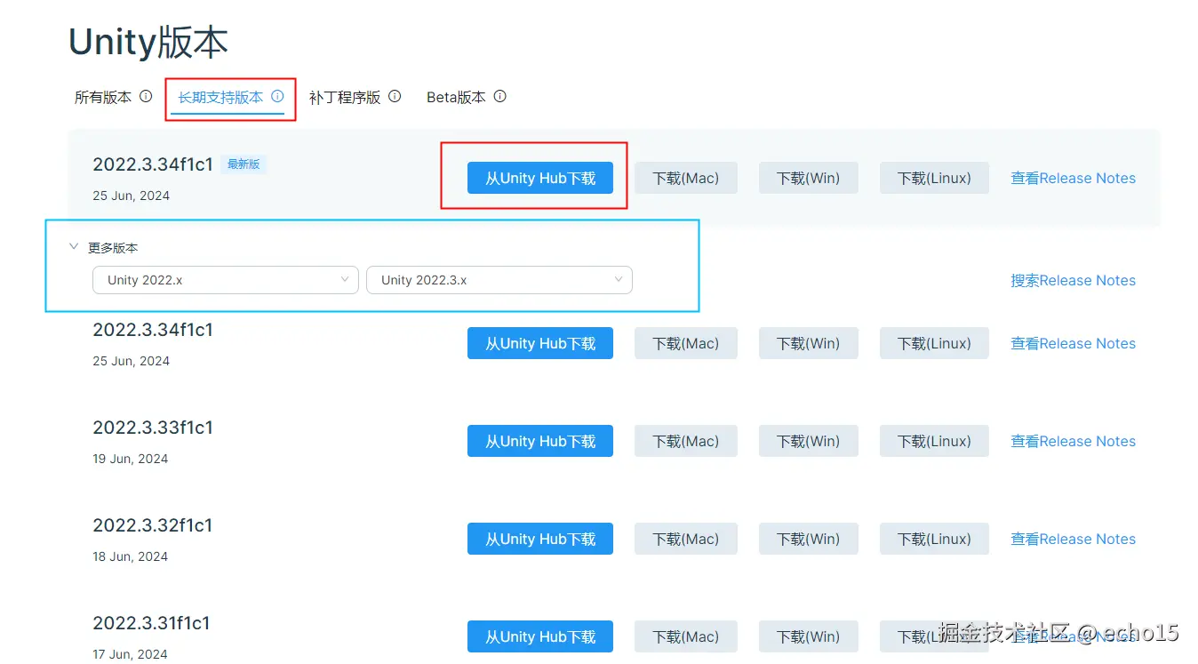 - 再次访问 Unity 官方下载页,在“长期支持版本”中找到适配的 2022 LTS 版本,点击“从 Unity Hub 下载”;
