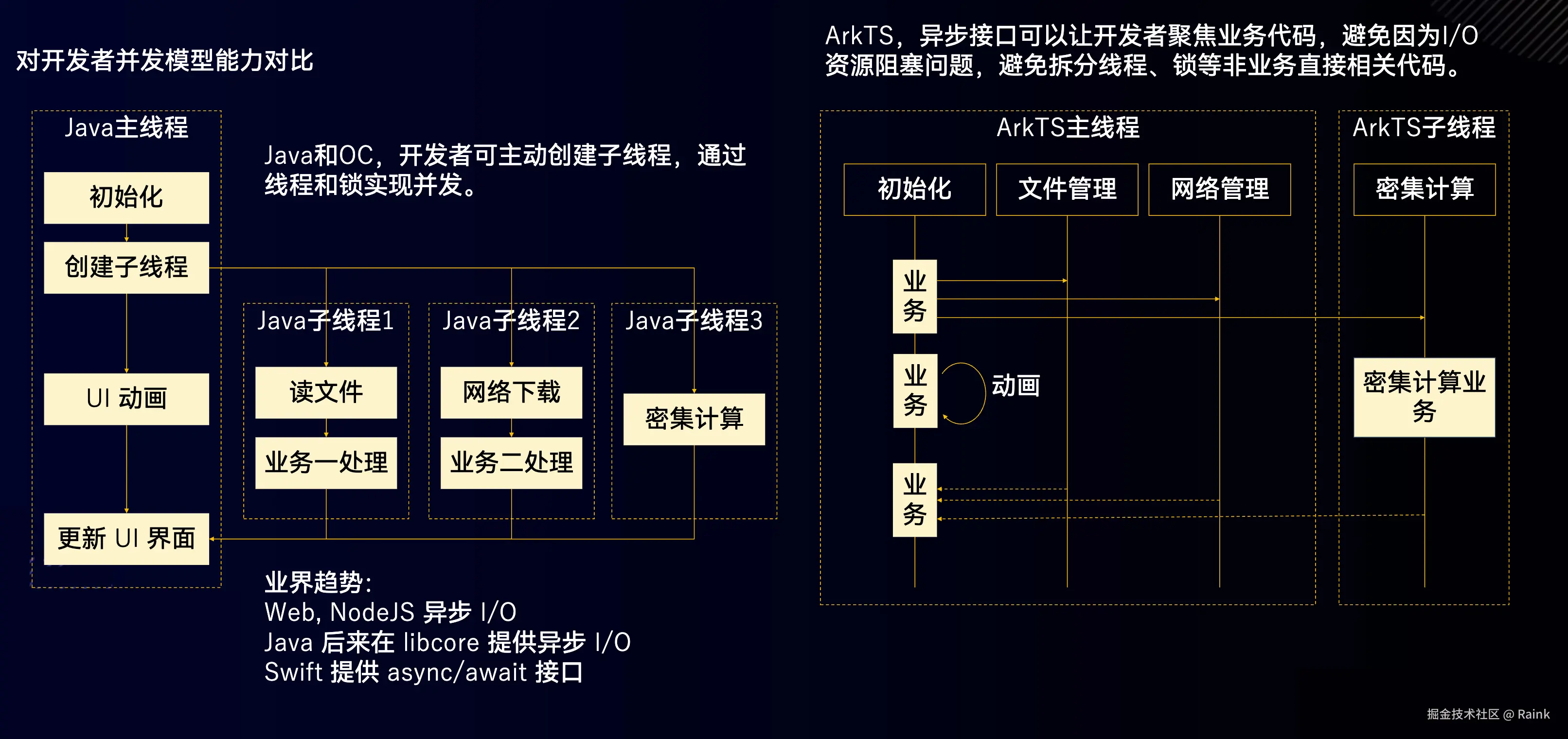 - ArkTS的异步方式:前端开发者更熟悉此模式,开发者无需过多关注执行顺序问题。文件操作和网络请求等均采用异步方式,使开发者能在主线程同时处理动画、文件管理和网络请求,无需考虑线程创建或竞争锁问题。但密集计算仍需创建子线程,实际API实现中后台操作仍在其他线程执行,只是对ArkTS开发者隐藏了线程管理细节。