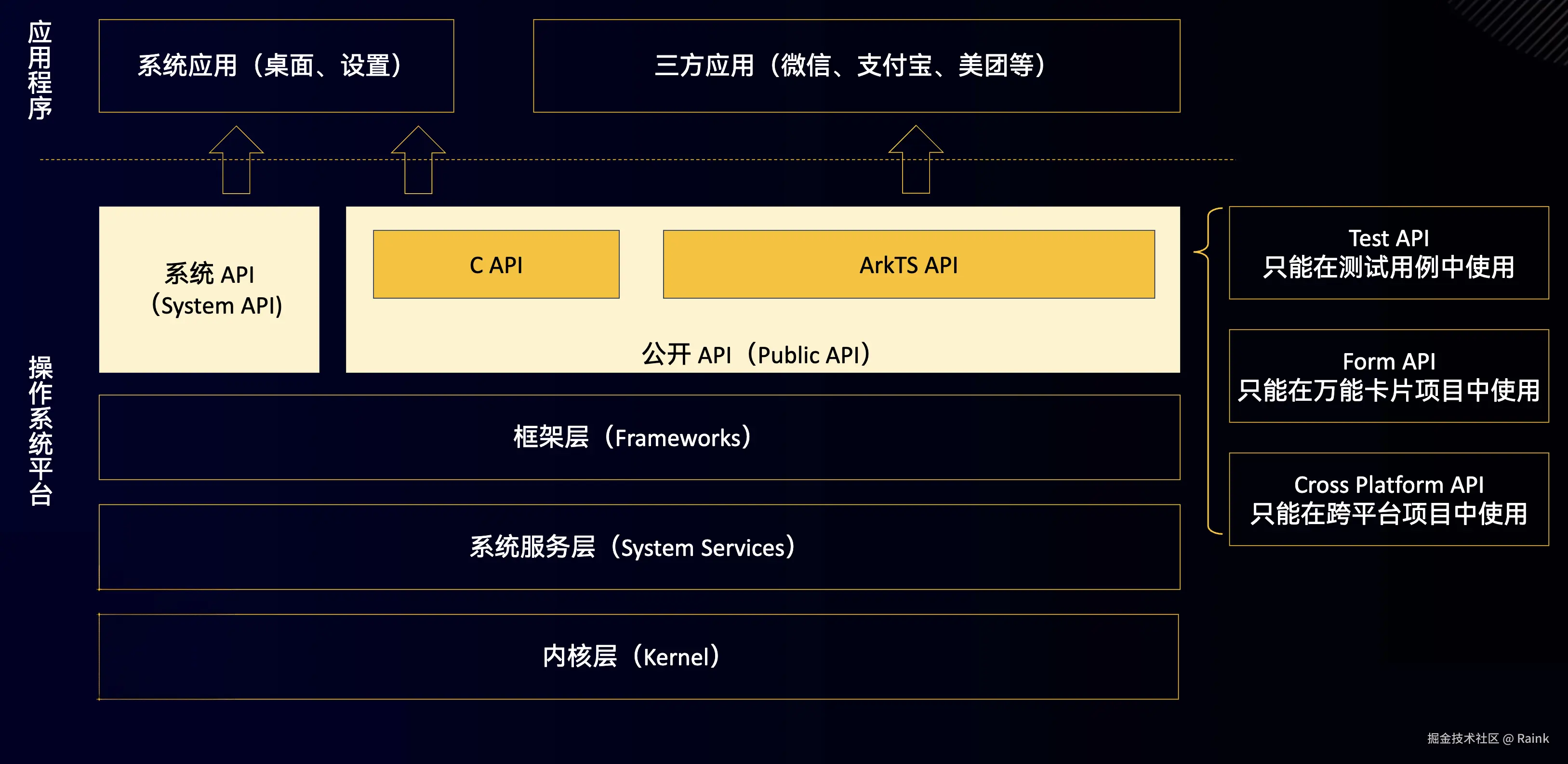 本部分将介绍鸿蒙API的分类,这些基础知识后续会频繁提及,因此仅作简要说明。鸿蒙API位于操作系统层之上,应用层之下,其作用是将系统能力全面开放给开发者,使其能够基于这些API开发应用。从使用角度来看,API可分为两类:系统API和公开API。