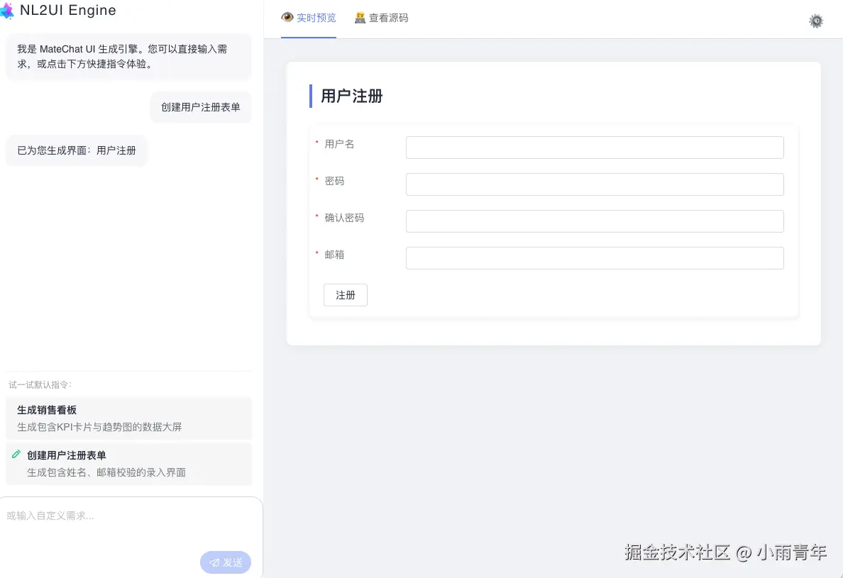 为了方便大家验证,我把这个引擎的完整代码都开源了。大家可以去 GitCode 仓库 gitcode.com/kaminono/Ma… 看看源码,或者直接点这个 mate-chat-nl-2-ui-engine-components.vercel.app/ 在线体验一下“说话变界面”。