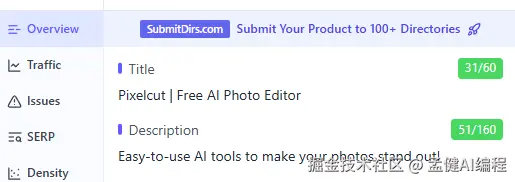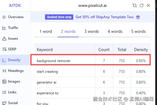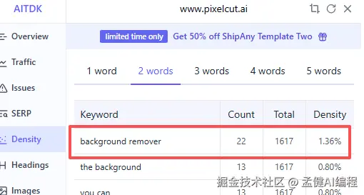 我们去看 pixelcut 首页的关键词密度,会发现它主打的是 background remover,这就很明显了,虽然它标榜是 photo editor,但是 SEO 意图很明显,它想吃掉部分这个词的流量: