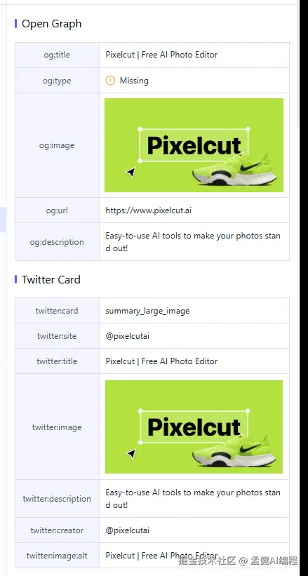 其次,它是有结构化数据的,以及 opengraph,也是到位的,我觉得从技术 SEO 的角度来说,这三件套是值得我们学习的,也是容易被我们忽略的。