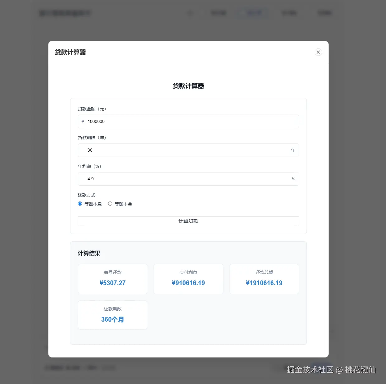 calculateEqualPrincipalInterest(loanAmount.value, loanTerm.value, monthlyRate);