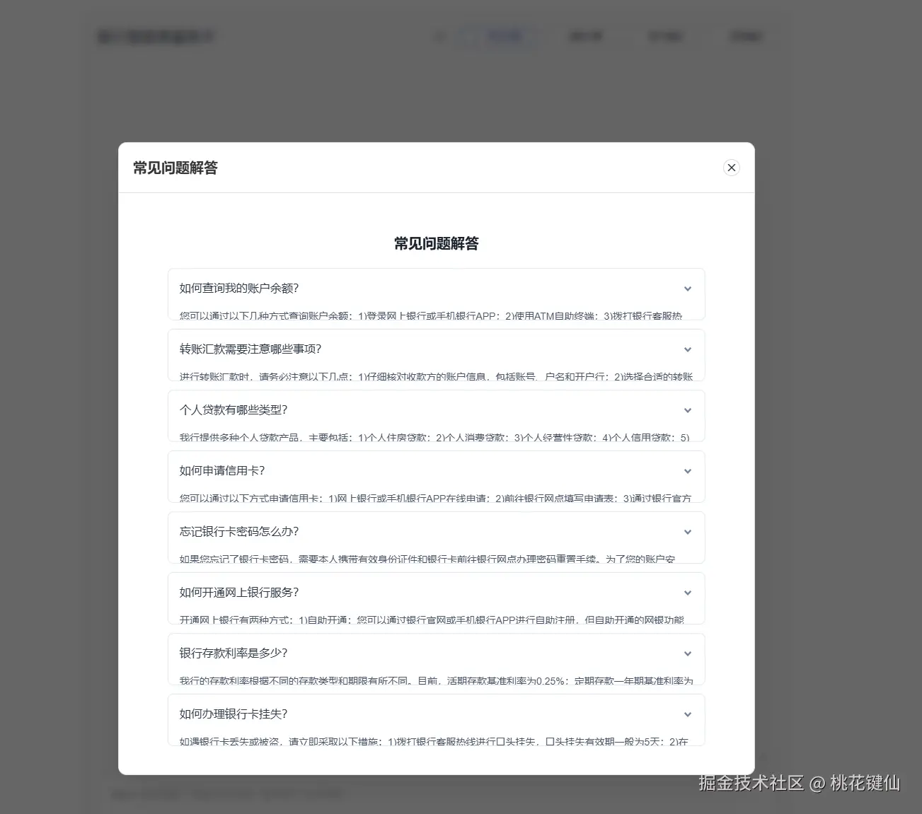 FAQ内容: 包含账户查询、转账汇款、贷款申请、信用卡服务等10个常见问题。