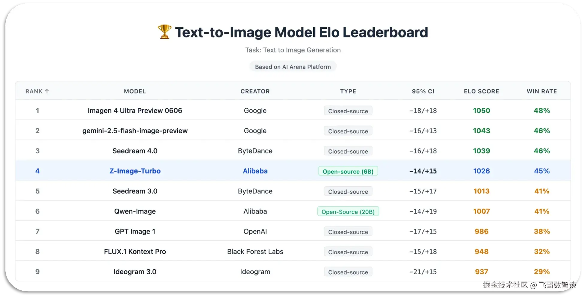 根据基于 Elo 的人类偏好评估(在AI Arena上),Z-Image-Turbo 相对于其他领先模型表现出极高的竞争力,同时在开源模型中取得了最先进的结果。