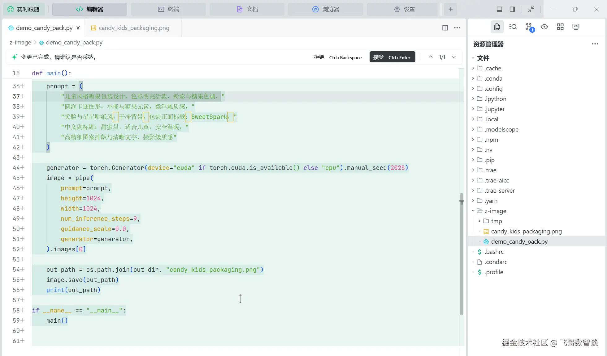 下面是生成的 demo 脚本,可以看到采用的 Z-Image 模型。