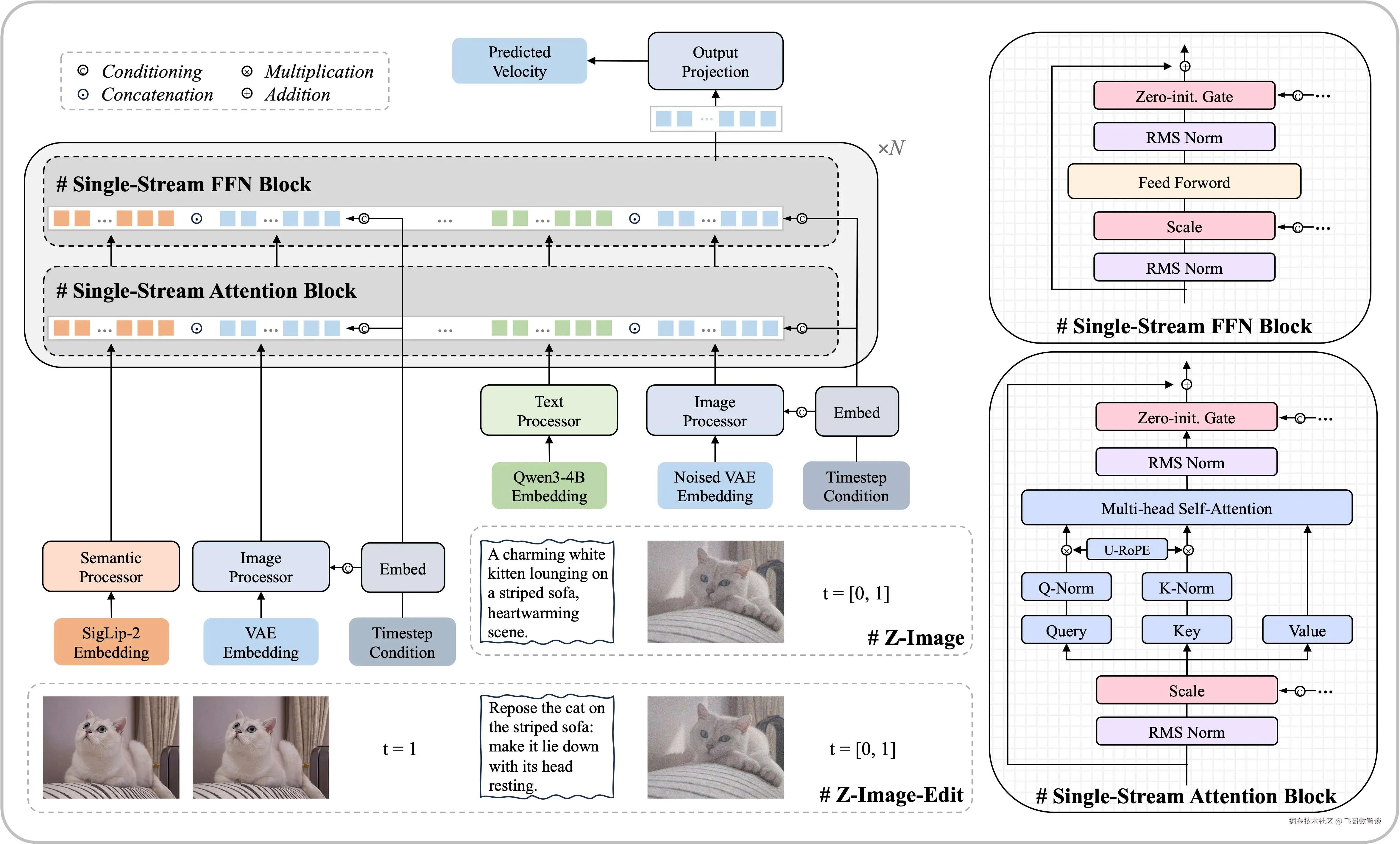 Z-Image 采用了一种可扩展的单流 DiT(S3-DiT)架构。在这种设置中,文本、视觉语义标记和图像VAE标记在序列级别上连接起来,作为统一的输入流,与双流方法相比,最大化了参数效率。