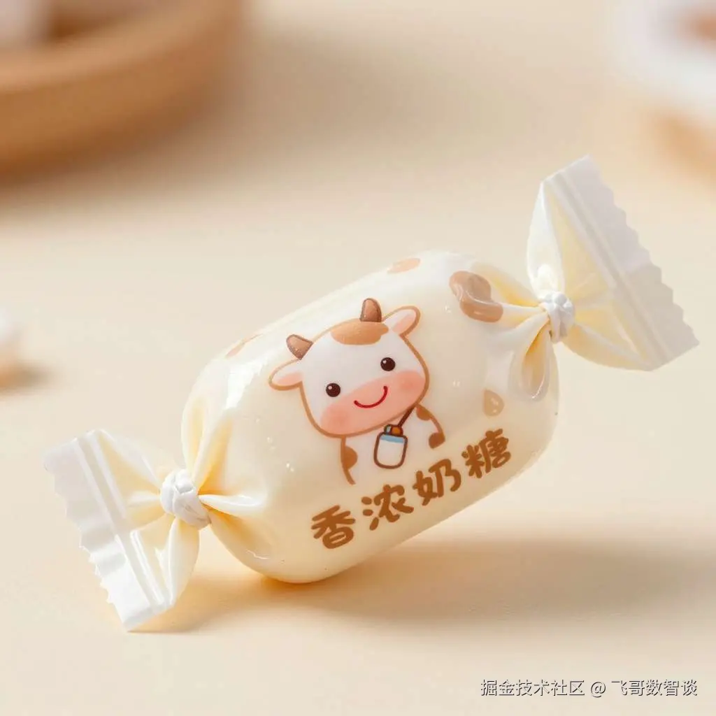 单粒牛奶硬糖,经典两端扭结包装,儿童风,奶白色为主色调,点缀浅棕色小奶牛斑点,包装正面印 Q 版微笑小奶牛(圆眼睛、短耳朵、脖子挂迷你奶瓶),半透明包装纸隐约透出米白色奶糖本体(糖体光滑有光泽),扭结处颜色为淡奶油色,包装纸呈柔和哑光质感,带轻微奶泡珠光,侧面印微型奶滴图案,正面下方用圆润卡通字体写 “香浓奶糖”,整体无尖锐棱角,色彩柔和不刺眼,暖光照射,8k 高清,细节丰富,适合 3-10 岁儿童