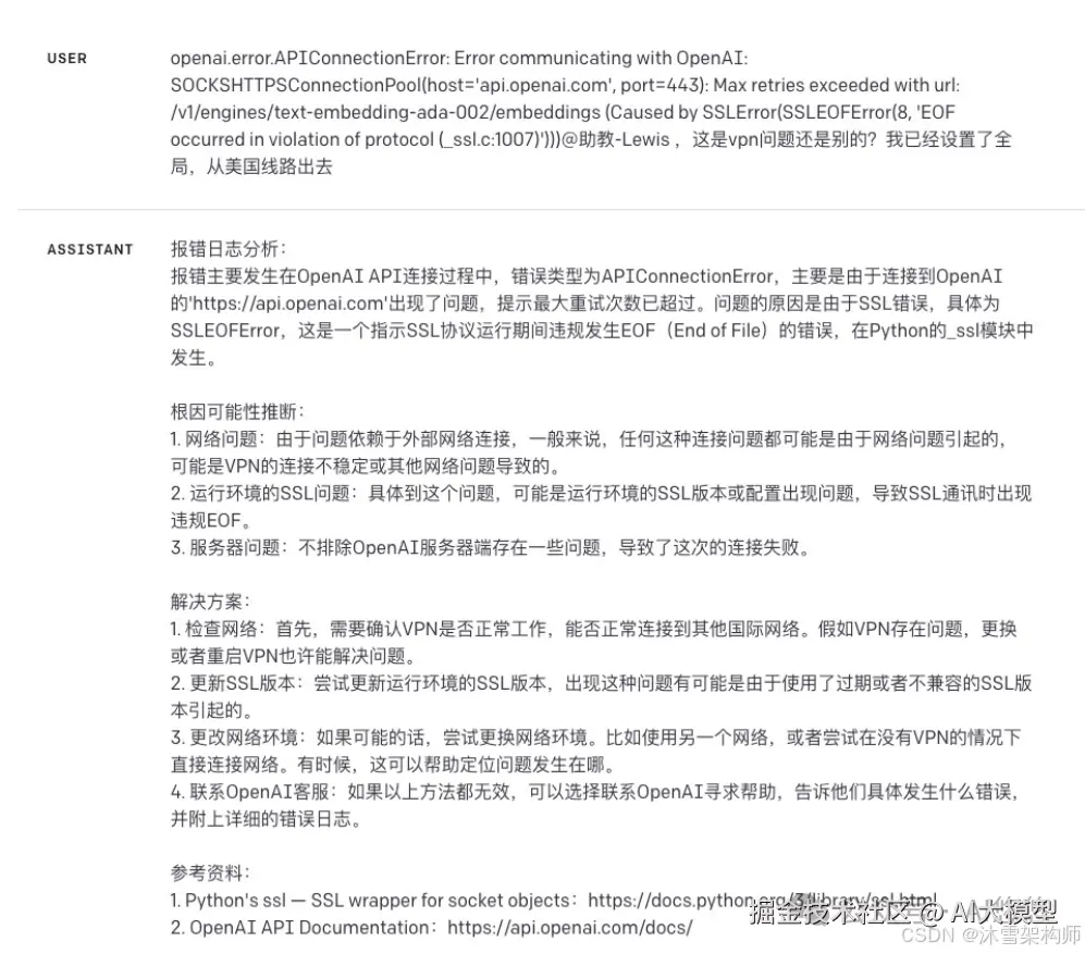 您将受到DEBUG问题,将每个问题分类为报错日志分析、根因可能性推断、解决方案、参考资料,分点陈列输出,格式如下所示: