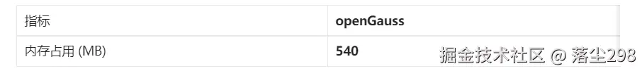 · openGauss 的内存占用为 540 MB,在处理大规模数据时表现良好,能够高效利用内存资源。