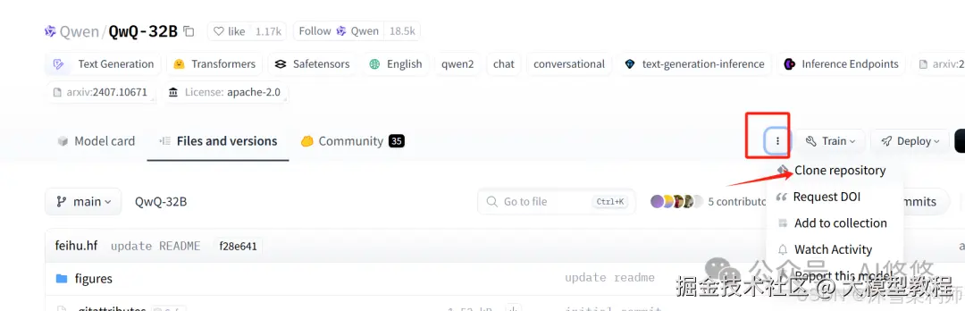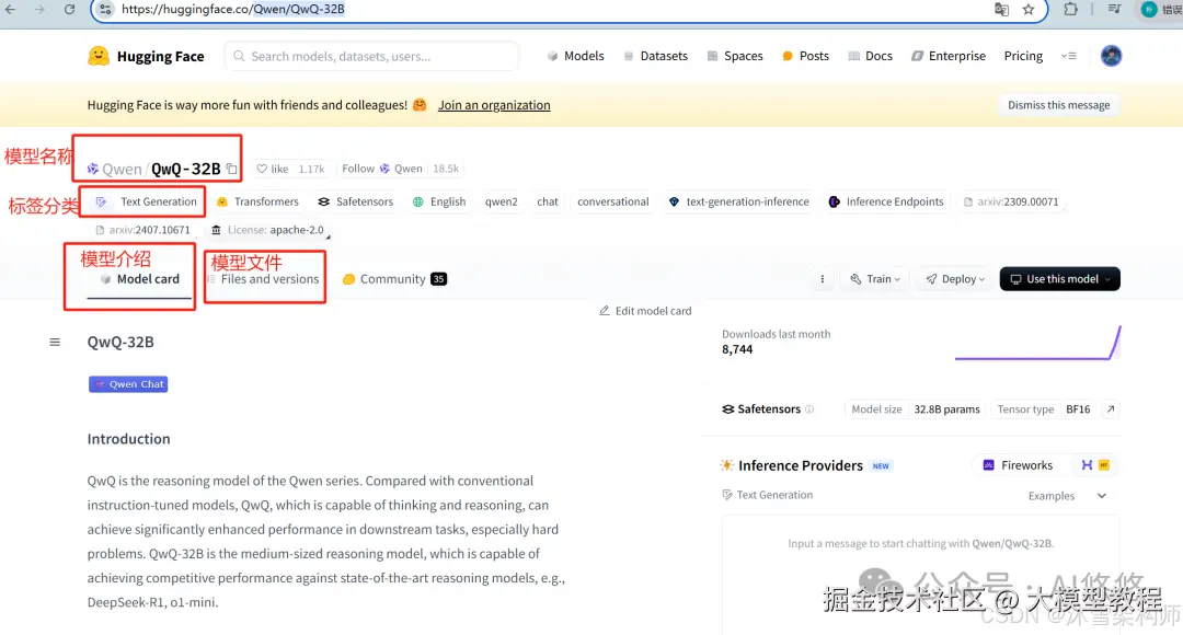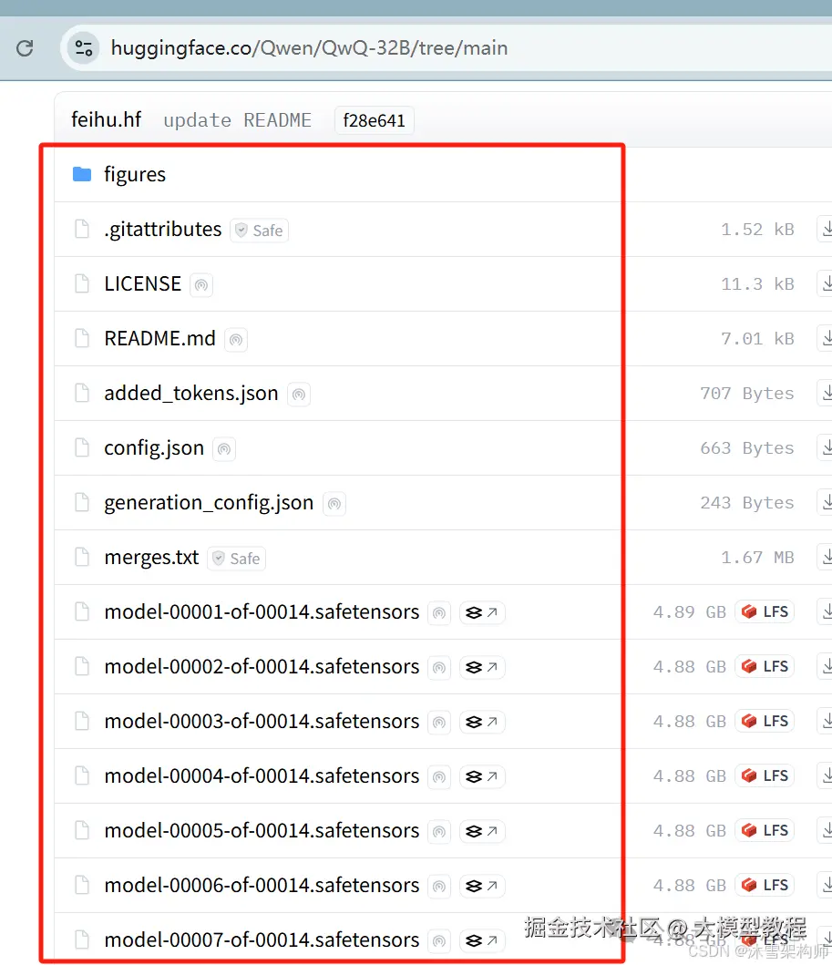 打开千问最新版本 Qwen/QwQ-32B,在"Files and Versions"模型文件页面下,可以看到很多类似”model-00001-of-00014.safetensors“ ,后缀 safetensors就是模型文件的名称。