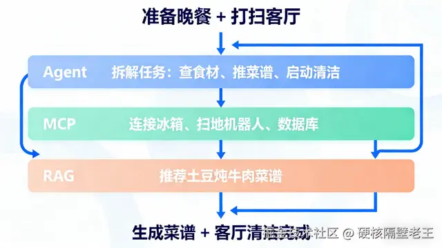 :通过 MCP 调用冰箱传感器(查食材)、扫地机器人(启动清洁)、美食数据库(查菜谱);