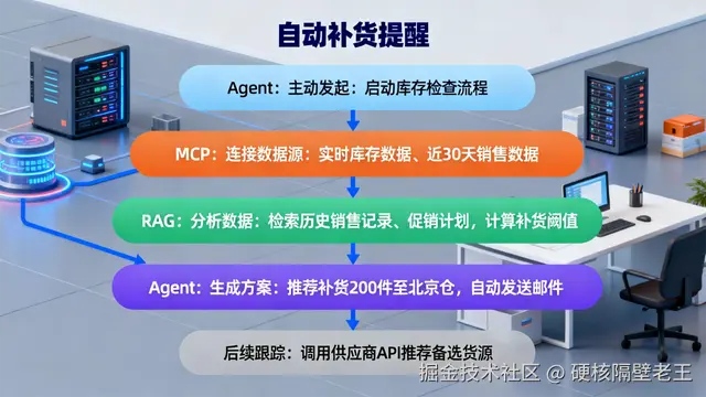 :结合 RAG 的分析结果,Agent 生成补货建议(“建议补货 200 件,优先发北京仓”),并通过 MCP 自动发送邮件给采购部门;